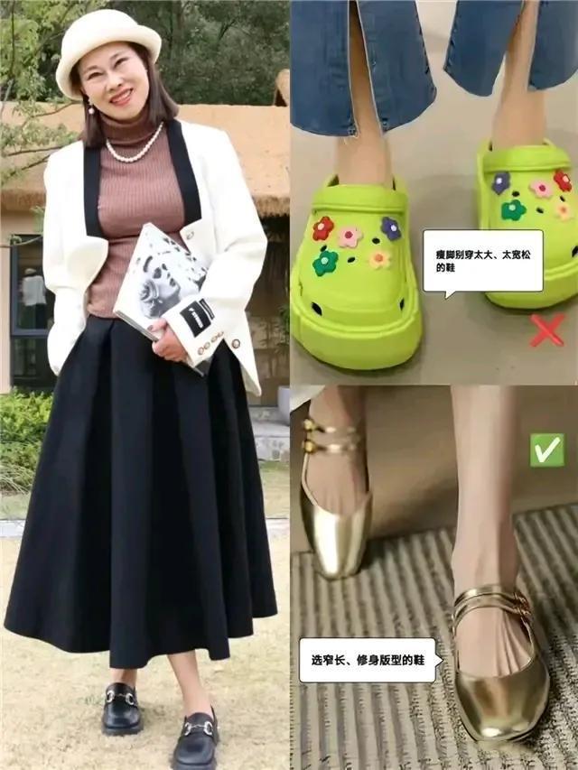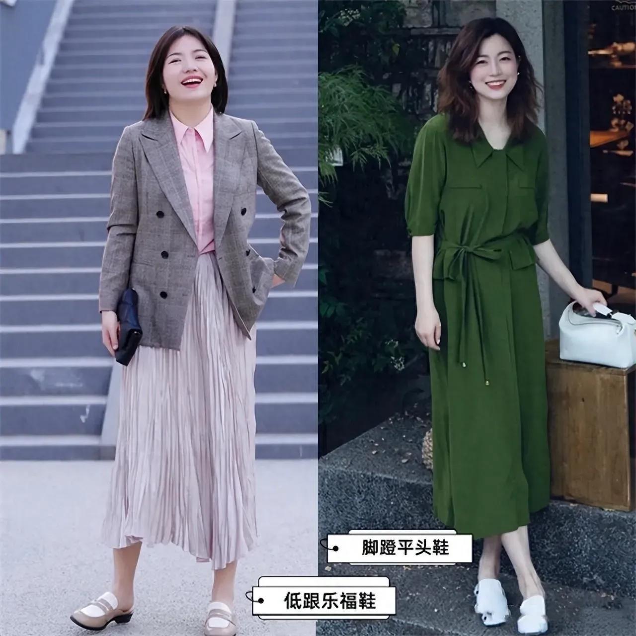 就算鞋跟不是很高,但也不能选择那种厚底的鞋子,例如下面右边的这两双鞋子,土里土气的审美已经过时,我们应该选择那种乐福鞋简约的经典款式来搭配上白色的半身裙和一件针织开衫来的,实在优雅得体大方。