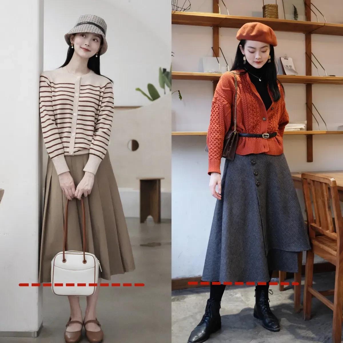 裙裙子的时候其实不要太长,盖过膝盖到小腿肚的位置,然后适当的留白最佳,这样才能更好的展现你的鞋子,也不容易压身,穿上一双黑色的短靴或者是棕色的浅口单鞋,下面这位达人用了条纹的针织开衫搭配上卡其色的压褶半身裙,脚踩一双浅棕色的玛丽珍鞋,头上戴了一款大野帽,使得穿搭着俏皮又有温柔感,这样的穿衣打扮很迷人。